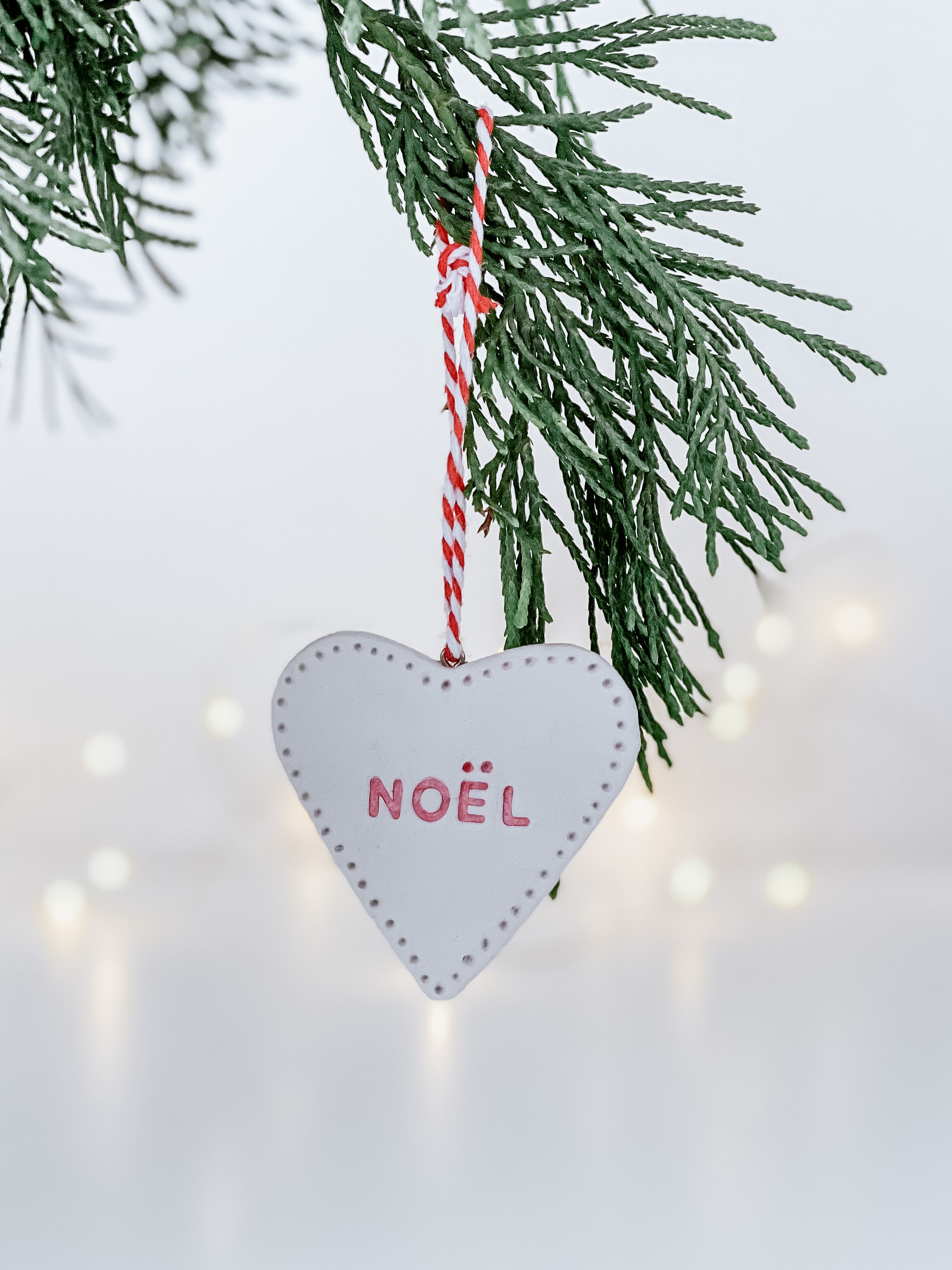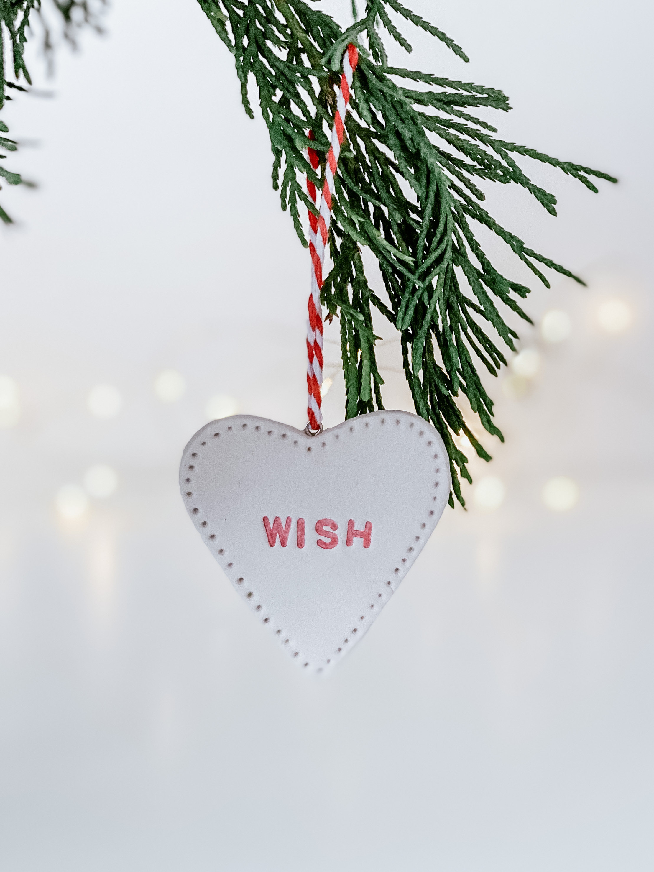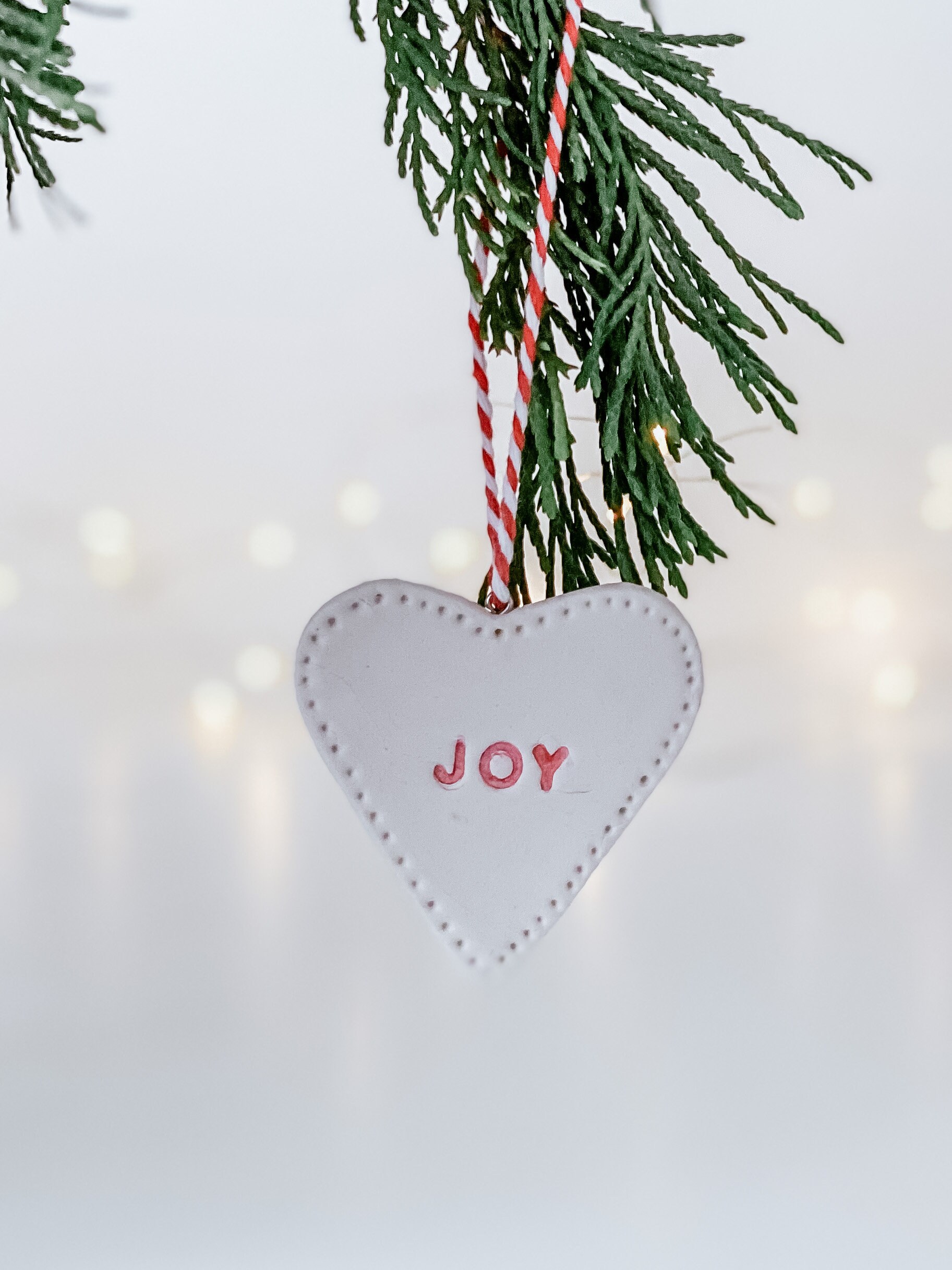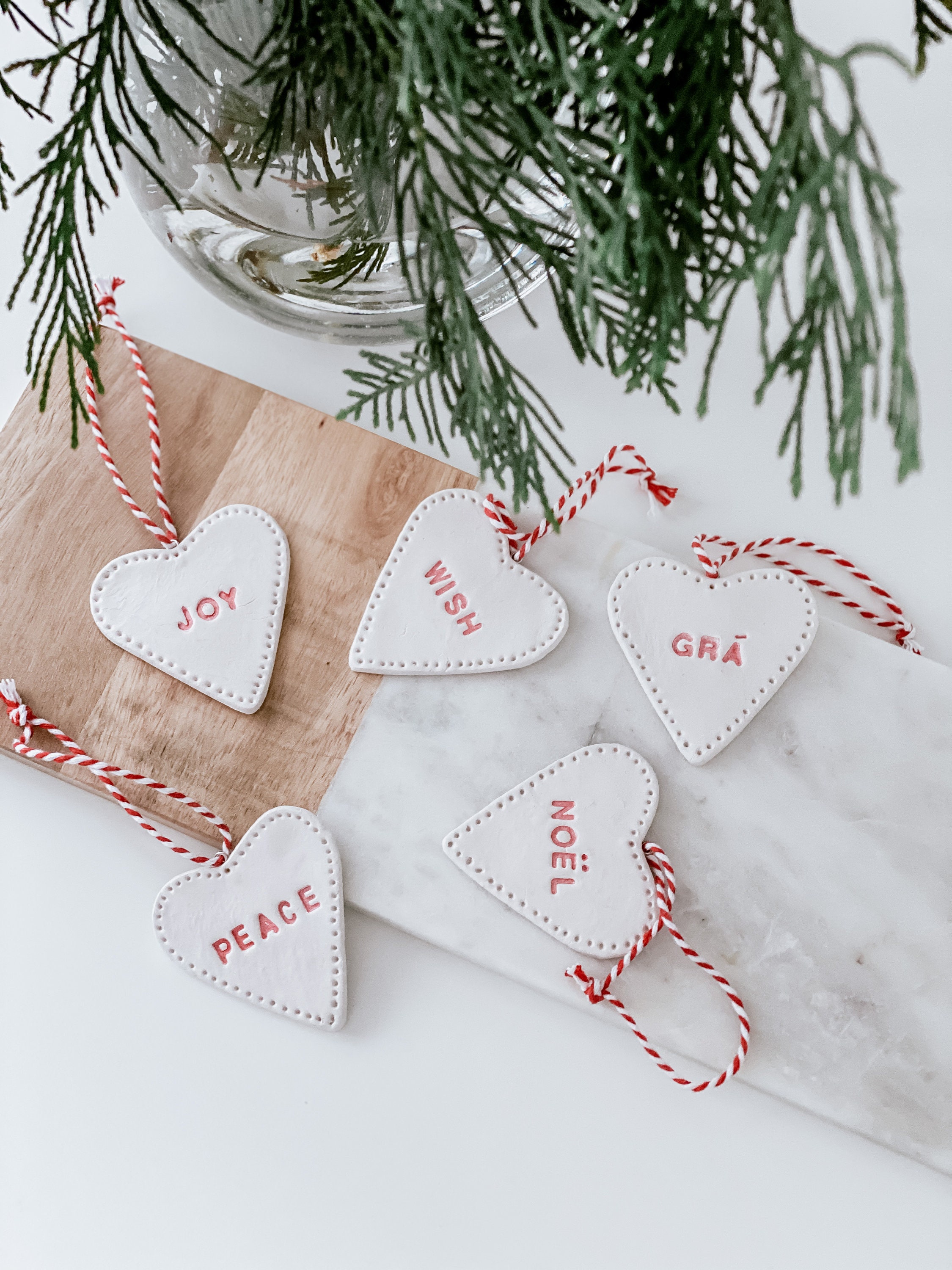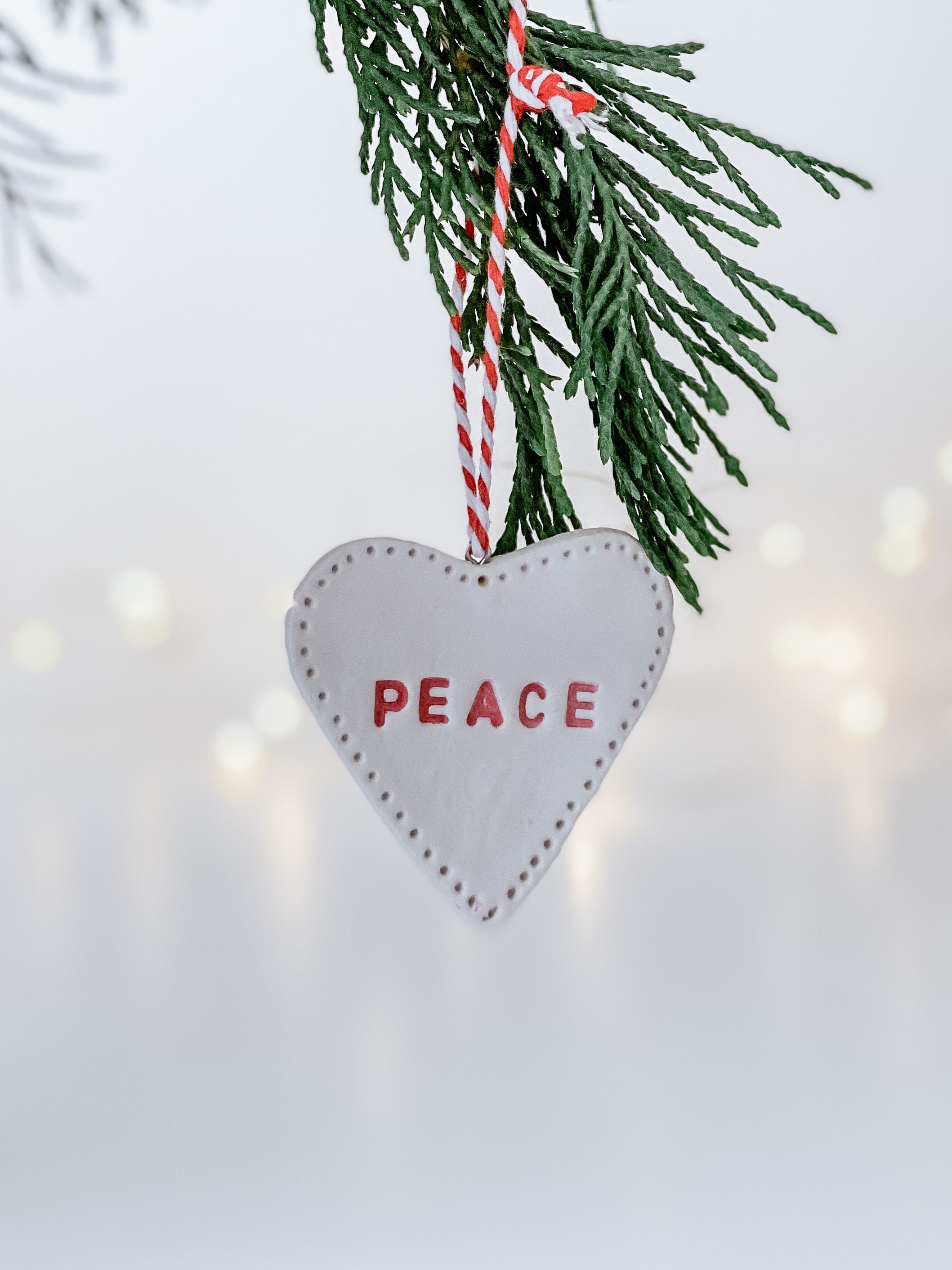 Clean, minimal style, white clay handmade and stamped in red font. Matt finish. Each piece has a tiny metal ring with red/white baker twine for hanging.